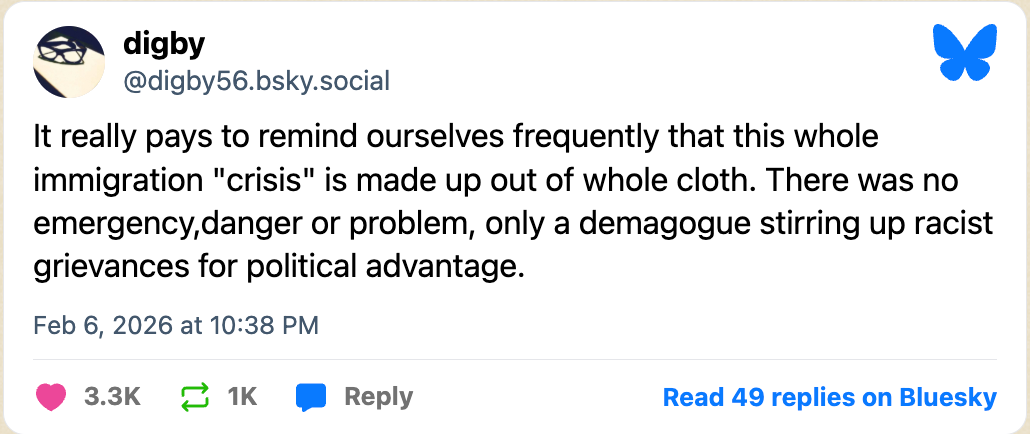 I think it’s something more than the “disapproval” registered by the polls, or the idea that Trump has gone “a little too far” in immigration policy—something more visible in the remarkable Democratic margins we’ve been seeing in special elections; I think we’re seeing is a literal disillusionment in Republican government, with a number of factors (the shameful attempt to conceal the Epstein evidence, the idiocy of Trump’s own narcissism projects, the failure to protect our health insurance premiums, the affordability crisis in housing in particular) of which the misconduct of ICE and CBP is maybe the most spectacular and photogenic aspect. We’re finally starting to understand we’ve been treated like fools and I think we’re getting angry.