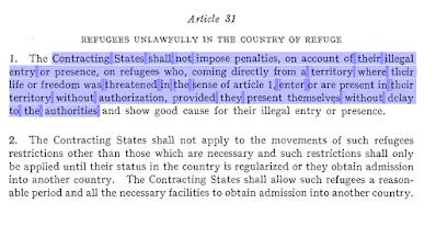 You see the contradiction here: §1158 says an asylum seeker is free to apply for asylum (or be transported to a safe third country) even if they entered the country in an irregular way, and remain free until the asylum claim is resolved; and §1325 says if they do it in an irregular way they’re going to prison and getting expelled afterwards, with a heavier penalty if they try again. The two provisions can’t both be right. And ideally, the right one ought to be the one grounded in the humane thinking of the period after World War II and not the racism of the 1920s. Just saying.