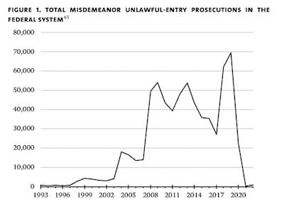 The backdrop is in two trends from between around 2000 and 2020; the rediscovery of §1325 as a tool for deportation in the early W. Bush administration and the drastic increase in asylum cases in Obama’s second term. The first really began in around 1998, but took off in 2002 and became huge with the start of Operation Streamline in 2004-05 under DHS Secretary Michael Chertoff: