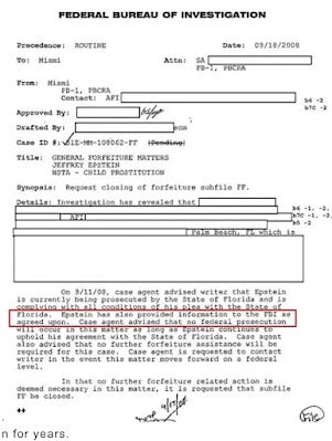 “On 9/11/08, case agent advised writer that Epstein is currently being prosecuted by the State of Florida and is complying with all conditions of his plea with the State of Florida. Epstein has also provided information to the FBI as agreed upon. Case agent advised that no federal prosecution will occur in this matter as long as Epstein continues to uphold his agreement with the State of Florida...”