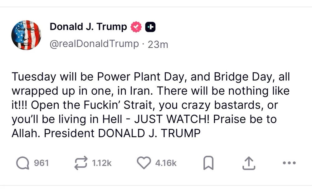 "Open the "Fuckin' Strait" is pure flipping the table and walking out of negotiations Deal-making (and I hear that written "Fuckin'" and correct spelling of strait as very calculated). He still wants a Deal and thinks he can threaten his way to one. Doesn't mean he won't pull the trigger. I'd bet he still thinks if he weakens Iran enough Europe or China or somebody will appear to clean up his mess. It's always worked before.